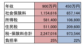 この表によると、年収900万円の人の方が税金と社会保険料の負担が大きいことがわかります。