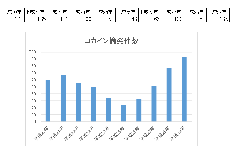 覚せい剤に比べればコカインの摘発件数はずっと少ないですが、平成29年はほぼ2日に1件摘発されている計算になり、今もどこかで誰かが使用していると言って間違いないと思われます。