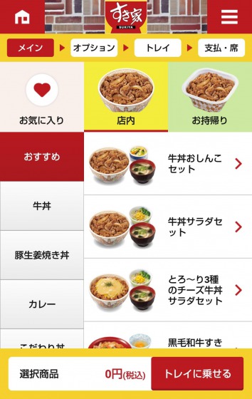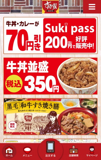 すき家のアプリをダウンロードして開いてみますと、こんな画面になります。