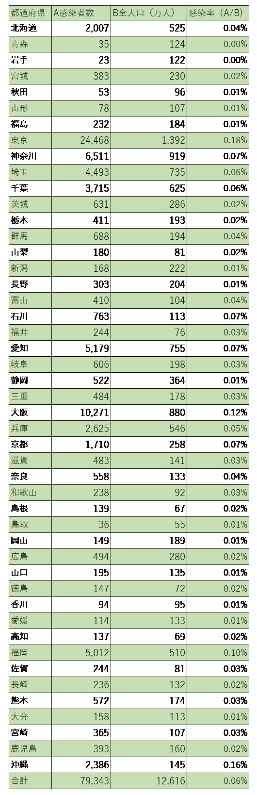 最多の東京は人口が多いから当然なのですが、感染率も最も高いという結果になっています。